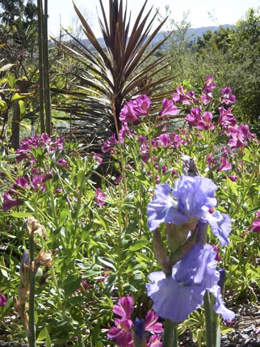 This is one of their demonstration gardens, with some blooming iris and alstromeria, with a cordyline in the background.