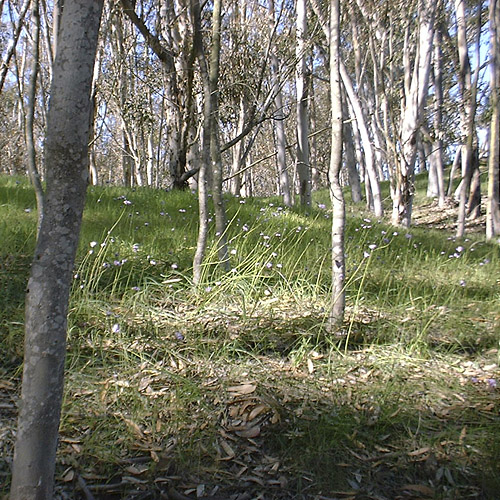 There had been heavy rains this past January, followed by occasional wet periods, so the ground was still moist in spots. The weather was now turning warm, sunny and spring-like. Grasses were growing exuberantly. It wasn’t long before I started to notice occasional flowers in the understory. Although the spaces under the eucalyptus prove hostile to most flowering plants other than the occasional also-imported black mustard, the blue dicks were pretty content to be there, a single plant here, big rafts of them there.