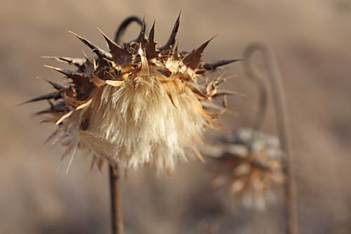 Flowering thistleThistle in bloom. I’m not sure if this is native or not, but it’s not the hyper-nasty Russian thistle (the dried flowers of which are shown in the large photo above). [Correction/edit August 1: This is actually a teasel, not a thistle. Like the escaped fennel above, this too is a renegade exotic species. Pretty, though…]