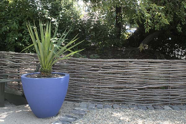 Oversized pots with spiky plants were a common feature. This blue potted succulent was set next to a rough woven vine fence in downtown Healdsburg, where we stopped for lunch. I’m sure their gardener pruned the pointy lower leaves off the plant to avoid injury to the masses passing through, but I personally hate to see gorgeous symmetrical plants disfigured this way.