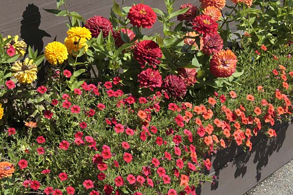 Being high summer, their plantings featured brilliant zinnias, marigolds and calibrachoa in what I’d call a real-world planting, selections that anyone could find at their local garden center, nothing too fussy or scary or exotic.