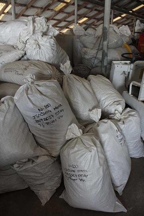 The best of these projects use plants with genetic material from as near to the area that is being restored as possible, or to at least use examples of plants from a similar ecological niche. (A California buckwheat from the coastal area might not compete so effectively as and example fo the same species from a desert area, for instance.) Recon Bags of Isocoma menziesii seeds Growing plants from location-sourced seeds is one of Recon’s specialties. Here’s an example: big sacks of seed heads of one of the plants that are called golden bush, Isocoma menziesii, from the Tijuana River Valley, waiting to be processed and sown.
