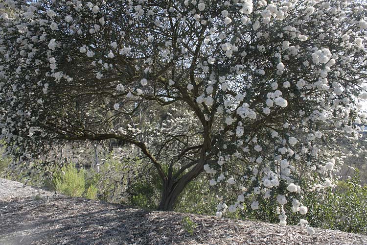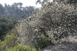 If my weekday desk had a window I’d look out on a the head of a little canyon that’s a mixture of introduced eucalyptus and a partially restored snippet of coastal sage scrub habitat. A couple hundred yards away in the re-wilded area are several of these ceanothus that have been glowing white for the last month with their clouds of flowers.