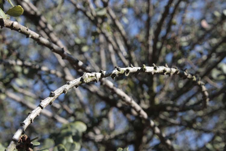 If you stopped to look at the plant, you’d easily see these interesting “warts” that give the plant its name. The warts are actually leaf-bases (stipules) that remain on the branches long after the leaves are gone.