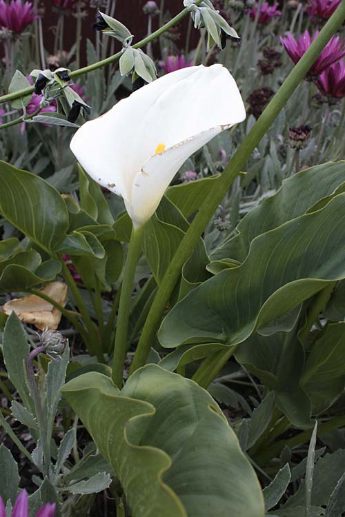 Calla lily (Zantedeschia aethiopica). I’ll have to admit that I have a soft spot for these plants and don’t pull them out the same way I pull out other unwelcome plants. My parent’s house came with a fifty-foot foundation planting of them on the north side of their house. The way the plant can spread, however, now makes me think the previous owners might have started with just a half dozen plants. Feral callas are plants of concern in some California wetlands. A couple well-watered garden spots seem to generate calla lilies out of thin air.