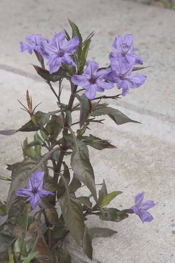 Mexican petunia (Ruellia brittoniana). Pretty, tough. Also pretty tough to eradicate in my garden once it got a foothold. I should have paid attention when the guy at the plant sale warned me that it might spread. According to Floridata, “Mexican petunia is listed as a Category I invasive species by the Florida Exotic Pest Plant Council. This means that it is ‘altering native plant communities by displacing native species, changing community structures or ecological functions, or hybridizing with natives.’ This warning applies to all parts of the state of Florida (and other areas with similar mild climates). Where hardy, the Mexican petunia excels at invading wetlands.” It also can be a nuisance in a dry garden like mine where it spreads underground and via exploding seed pods.