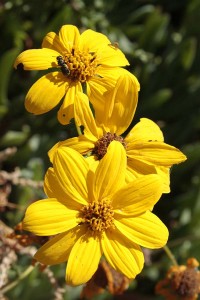 This last one’s San Diego County sunflower. The current botanical name is Bahiopsis laciniata though I and everyone else I know around here learned its name as Viguiera lacinata. Its flowers come in at about an inch and a half across, so it’s smaller than the previous two. But a blooming bush of it makes a low, neat mound in the garden or in the local wilds. Of these three, the flowers have the most “refined” look to them–if you consider French marigolds and yellow cosmos to be refined plants. Because of it being a local plant it’s a fairly common denizen of local native plant gardens. Also, a lot of coastal-zone roadside restoration projects around here seem to have this plant in the mix.