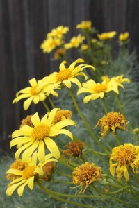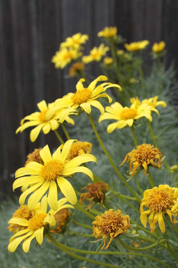 Giant coreopsis, Coreopsis gigantea, earns its name more from the tall plant size rather than the size of its flowers. The weird plant will eventually form what looks like a trunk from three to six feet tall that sprout finely-cut leaves. This takes a few years–My two year old seedlings are in the two to two and a half foot tall range. Blooms are perky yellow daisies about three inches across. I planted a little grove of these in a back corner of the garden, but the grove has dwindled to just a few plants thanks to a gopher that found the little tree trunks too delicious to pass up. Grrrr. Times like this I hate hate the full circle of nature.