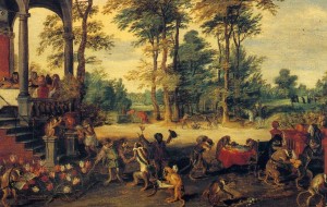 As unflattering as the speculators appear, in some ways the previous image of Flora’s wagon comes off as being a stronger indictment of the damage done to a general population by a moneyed elite. Still, Brueghel’s monkeys are pretty wild and I like his work better as a painting.