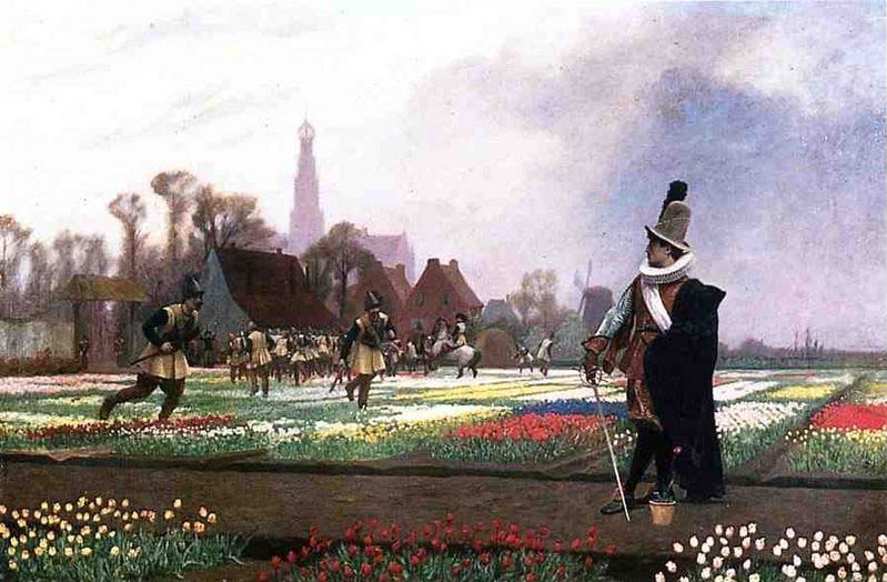The scene takes place during the 1630s tulip mania and shows a soldier guarding a potted tulip, while other troops stomp out fields of flowering bulbs. The piece was painted in 1882 during a time of economic distress around the Paris Bourse Crash, a time even more economically unsettled than our own. Gérôme was painting tulips and the tulip folly alright, but he was also commenting on his own day, which saw a great stock market crash three and a half centuries after the collapse of tulip values.