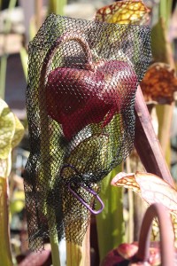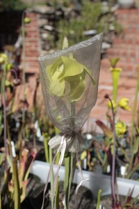 These bags don’t provide protection against smaller pollinators. After doing a little more research it appears that the gold standard for material for hybridizing bags seems to be reemay, the breathable spun polyester that’s used for floating row covers in the garden. Scientific papers frequently cite Reemay bags being used in controlled pollination situations. That stuff is bright white and really stands out in the garden. Fortunately these bags only need to be on Sarracenia flowers for two to three weeks, so you won’t be defacing your garden permanently. Still, while your plants are wearing them, you might have to do a little more explaining to people visiting your plant collection…