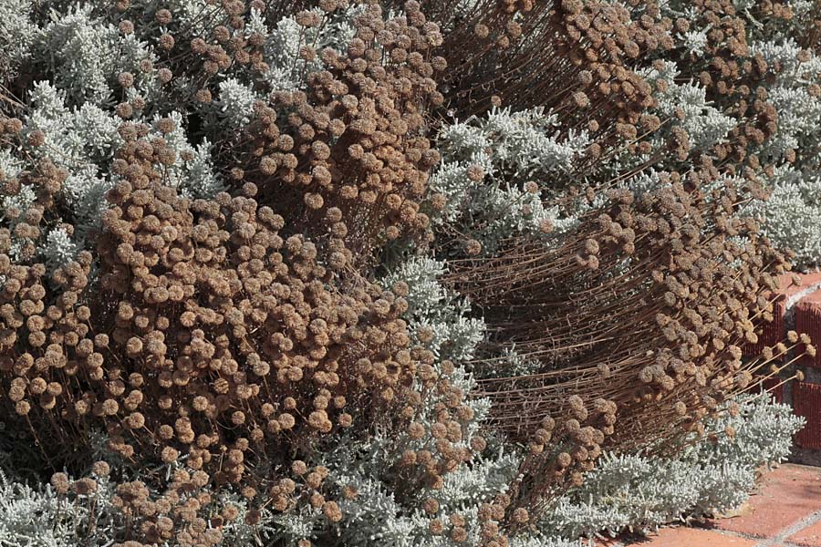 This santolina sums up the state of the garden pretty well. Peak flowering was in the past or hasn’t started up yet, but I’m enjoying where it’s at right now. This particular plant bloomed four months ago, but I liked the dead flower heads so much that I’ve left them on the plant.