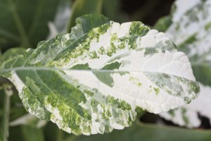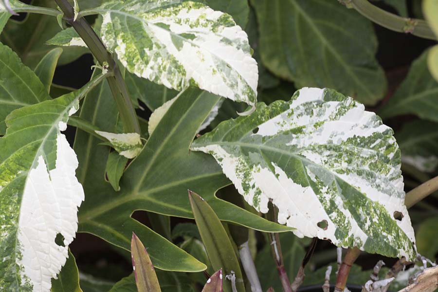 This is probably the most dramatic of the alligatored leaves. Even though many leaves are variegated, you can see that it hasn’t stopped those parts of the plant from flowering.