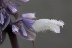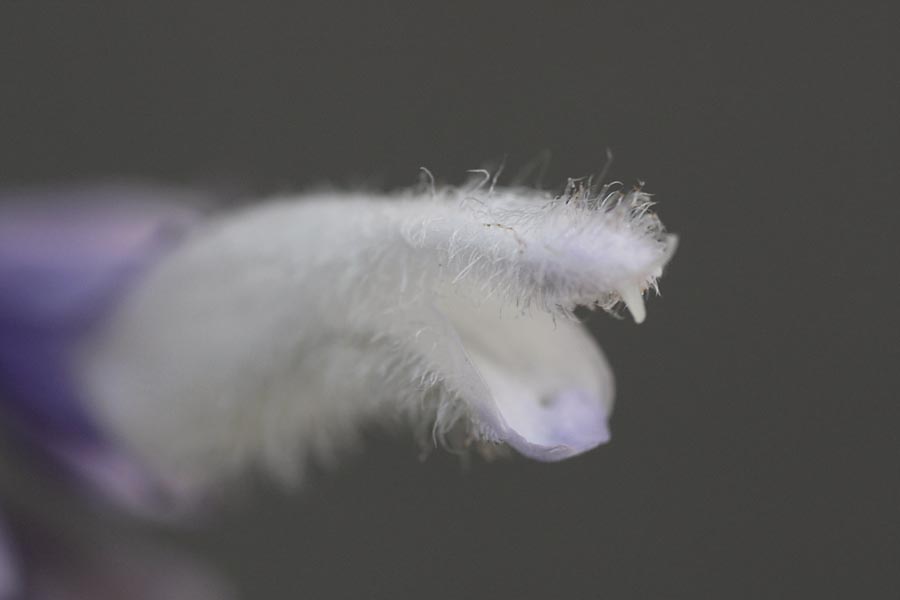 The blooms are fuzzy up-close, like some other salvias, including the Mexican bush sage, Salvia leucantha, a dependable low-water plant that’s common in Southern California and beyond. This blossom looks very friendly in a lisping, come-hither, snaggletoothed sort of way.