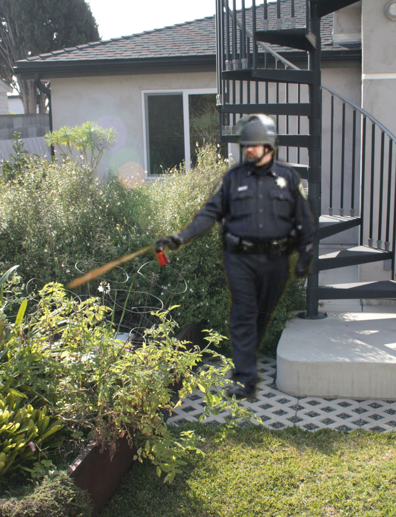 In this photo Lt. John Pike of the police force of the University of California, Davis demonstrates the proper way to apply pesticides and fungicides in your garden. The lieutenant’s top tips: