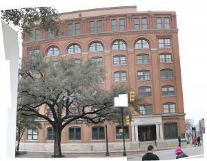 The museum–no interior photography allowed, sorry–builds a narrative that leads up to and recedes from a re-creation of the sniper’s nest on the sixth floor of what was back then the Texas Book Depository building. From the outside, immediately below the cornice, there on the right, you can see the infamous partially-open window.