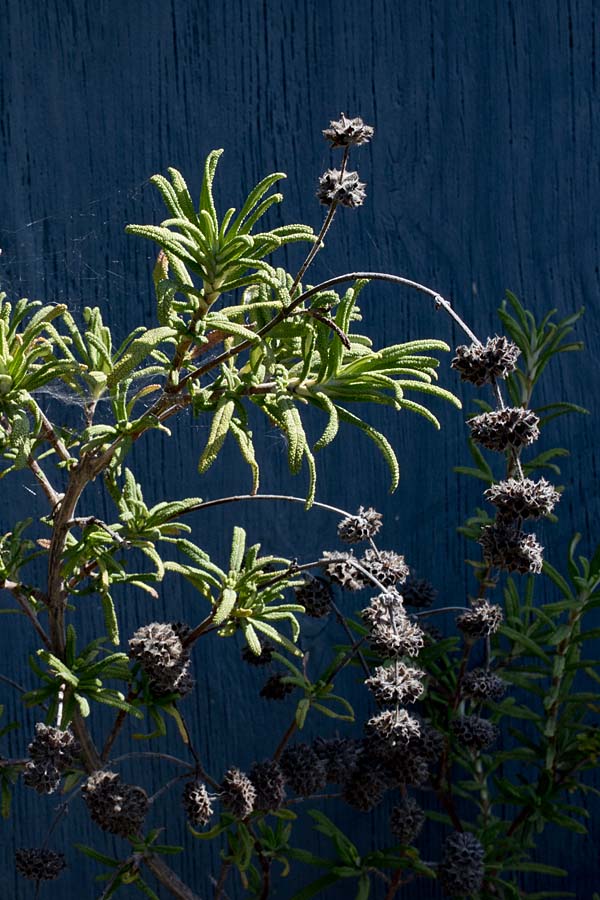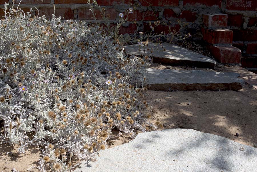 A sure sign that autumn is here, the dried flower heads and supporting stems from San Miguel Island buckwheat, Eriogonum grande var. rubescens. If you water the plant more than I do it’d stay a little greener. This plant is anything but dead, with there still being lots of green closer to the crown of the plant. Some people would cut all this back, but I really like how it looks draped over this patinated wall.