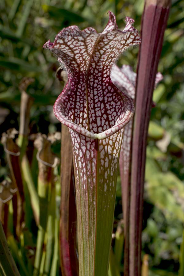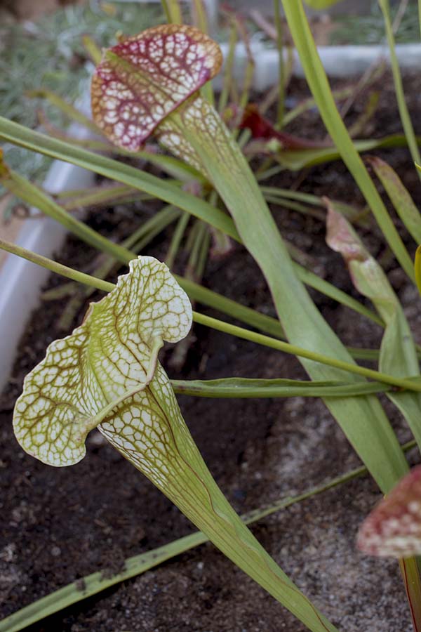 Sarracenia leucophylla “Super Swamp Ghost,” putting out some new pitchers for the fall. This is the original full-frame image. The picture has stuff on the margins that I thought was pretty distracting.