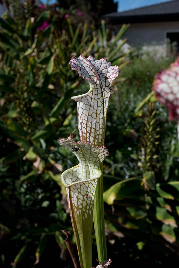 Lovely photos of your Sar­race­nias. Much as I love the markings on the others, my favourite is the Green Monster – looks rather muppet-like, somehow. As to cutting back the Eri­o­gonum, that would be criminal, it looks beautiful against that wall.